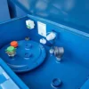 Cette cuve chantier haute résistance peut facilement être chargée, déchargée et déplacée: il y a des pieds pour la lever avec le chariot élévateur (en état vide ou rempli) et des anneaux de levage pour la déplacer avec une grue (seulement en état vide).