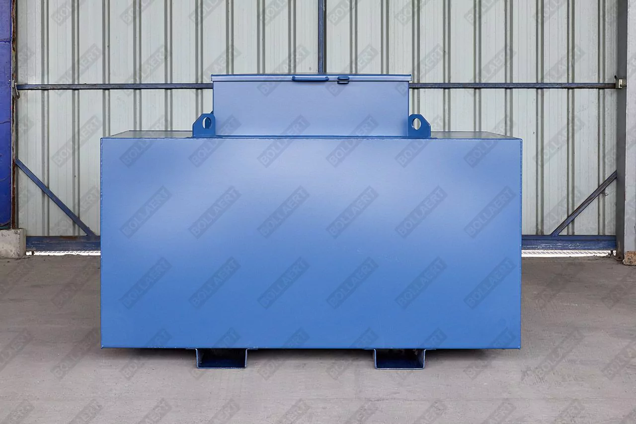 Nous pouvons monter une pompe sur cette cuve, de sorte que vous puissiez faire le plein de vos véhicules sur le chantier. Le système de pompage est bien sécurisé dans la partie verrouillable.
